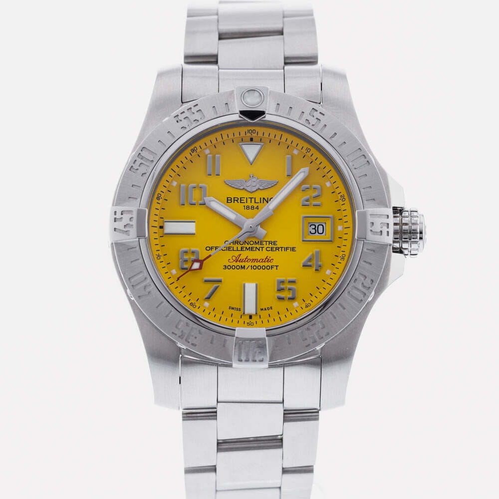 Breitling might be more known for their pilots’ watches and chronographs but that didn’t stop them from throwing their hat into the ring with an outrageously deep-diving diver. The Avenger II Seawolf can go to depths of 3000 meters or 10,000 feet, deeper than nearly any submarine has ever traveled, let alone a diver. With a quintessential Breitling stainless steel bezel and a bright-yellow dial that looks like it could be seen miles beneath the ocean’s surface, this a perfect beach-to-ocean-bottom watch for summer vacations or dreaming of warmer weather and deeper waters than the local pool.