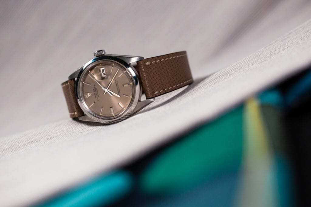 Last but certainly not least among our picks for handsome brown dial watches for fall is the legendary Rolex President. The President is typically instantly recognizable for its all-yellow gold construction. However, this incredibly unique brown-dialed variation features the brand’s Everose gold. In addition, the dial boasts a striking texture, giving the model both depth and contrast. If you’re looking for an exceptional alternative to the typical President for all, this is your watch.