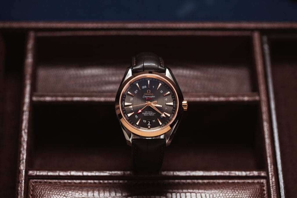 OMEGA first debuted a GMT variation of the classic Seamaster Aqua Terra back in 2012. This marked the brand’s first co-axial model to come equipped with a GMT complication. The model features a modern 43mm case and striking teaked dial. OMEGA offers the model in three colorways: an 18-karat rose gold, stainless steel, or a two-tone 18-karat rose gold and stainless steel. Here, we see the former, complete with a complimentary warm brown leather strap and dial.