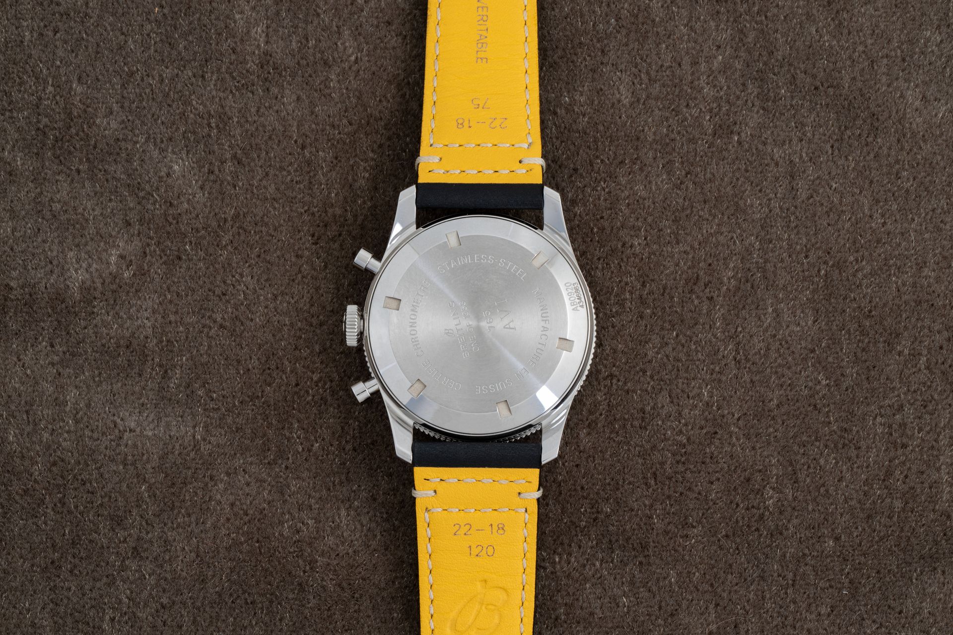 Powering the watch is Breitling’s caliber B09. Like the original, it’s a hand-wound column wheel movement. Winding the watch put a smile on my face. The crown is incredibly communicative, and you can feel each click of the ratchet wheel as it advances. You cannot see the ratchet wheel turning, however, because the watch features a solid caseback. A good thing.