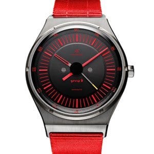 The Monoposto was Autodromo’s first automatic watch, based on the gauge of a 1950s Grand Prix car. The goal with the design was to make the watch feel oversized–thin bezel, large dial–without being too large at 43mm. And the red line on the crystal? An homage to the old practice of applying red tape or paint to the glass of a dashboard gauge, so a driver could see the limits of his engine during a race.