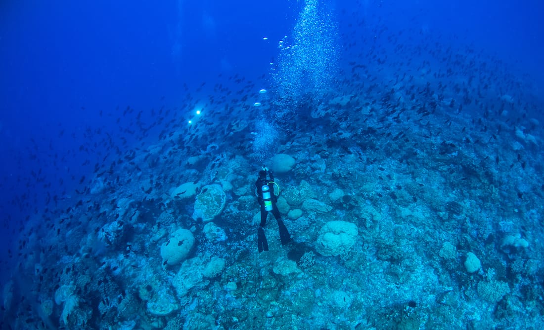 The author diving off of Clipperton atoll. (Photo: Alex Rose)