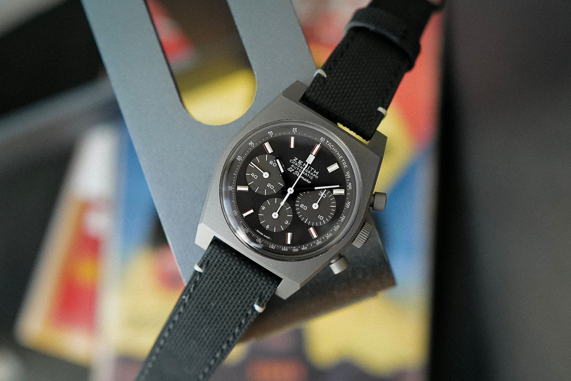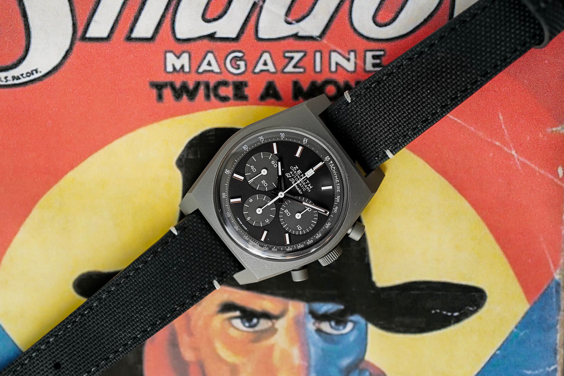 To best illustrate my entire thesis here, I am using a watch that I have been secretly obsessing over for about two years now: the Zenith Revival Shadow. Ever since Mr. Jon Bues wrote his Hands-On review of the watch back in 2019, I was hooked. With each photo I saw, I found myself thirsting for the watch, more and more. What got me, from the photos in his article, was the high contrast of the white dial text against what appeared to be a matte textured black dial further contrasted by the grey micro-blasted case. Everything was matte, toolish, industrial, and purposeful. A classic design was brought forward in an incredibly modern package peppered with vintage cues via the typography and general dial styling.