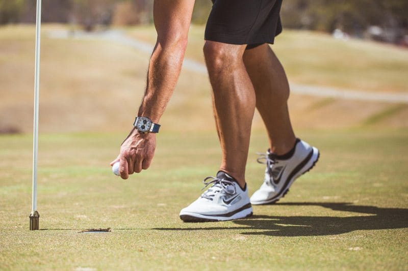 So while they may look nice, don’t wear a dress watch while golfing; its movement is more sensitive to impact than a sports watch. Following that same vein, wearing an 18k gold watch is not a great idea. Gold is soft, and on the green, there’s a good chance you could ding your watch and leave a dent. Also, avoid leather straps. Perspiration can ruin it over the course of a game.
