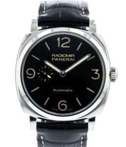 As the days grow shorter and nights grow longer, you’ll want a watch with optimal legibility in any condition. The Radiomir was a groundbreaking model when it debuted in 1938. It incorporated the brand’s patented luminous material, which gave the watch its name. This variation features a sleek black color scheme. In addition, contrasting cream accents in the stitching of the leather band and on the dial nicely compliment the all-black look.