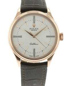 We’d be remiss if we didn’t have a Rolex on our list of favorite watches with leather bands for fall. For that holiday gala or black tie fundraiser, a “tuxedo watch” like the Cellini is an essential accessory. The refined design of this time-only model never goes out of style. This particular version features a stunning rose gold case and supple leather bracelet that’s seasonal and stylish.