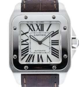 Cartier’s iconic square-shaped watches are a fun way to shake up any fall ensemble. The Santos likewise has a rich history that spans over a century. In 2004, on the year of the model’s 100th anniversary, it got a modern update. Cartier released the Santos 100 collection. These larger models maintain the distinctive design of the original, like the industrial exposed screws. A handsome leather strap perfectly complements the sporty nature of the pilot’s watch.