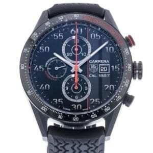 TAG Heuer has made a few limited edition Carrera timepieces celebrating the historic Monaco Grand Prix. This particular variation launched in 2014 in a run of just 2500 pieces. What makes it unique is its sandblasted pure titanium case construction treated with black titanium carbide coating. TAG Heuer compliments the look with a black ceramic bezel and contrasting white tachymeter scale. In addition, the model showcases a sporty dial design featuring two, tonal racing stripes and red accents. Two chronograph registers with a circular guilloche finish align on the vertical axis while the third sits opposite the date window. Each detail works harmoniously together to create the look and feel of a dashboard. Last but not least, the model is powered by the caliber 1887 self-winding mechanical movement. You can see it in all its glory through the sapphire caseback.