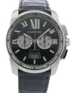 The Calibre de Cartier was the brand’s first sport model to feature their own in-house movement: the 1904 MC. It boasts a 48-hour power reserve along with a sub seconds and a date function. Cartier showcases the impressive movement through a sapphire caseback. This variation features a matching black dial and leather bracelet. The all-black color palette is contrasted white hour markers and the brand’s iconic sword-shaped hands.