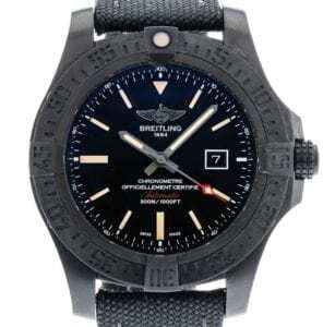 Despite the limited edition Avenger Blackbird’s imposing 48mm size, it’s surprisingly lightweight with its titanium body. The model gets its all-black appearance with a thick black coating of highly carbonized titanium on the outer layer. This rugged yet sleek construction pairs perfectly with a matching and equally masculine canvas strap. Inside, you’ll find Breitling’s Caliber 17 COSC-certified self-winding mechanical movement with a 40-hour power reserve.