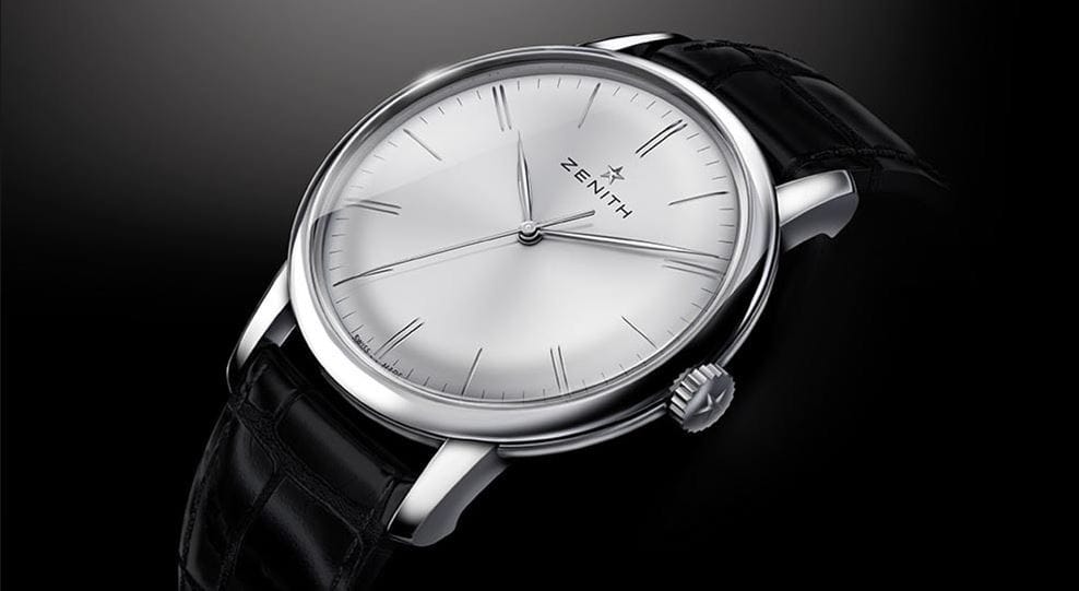 The new Zenith Elite 6150 is the first watch to have the new Elite base caliber. It has an ultra-thin case with a diameter of 42mm. The ultra-thin case is 9.45mm thick and is designed in the shape of a pebble, with tapered and sloping lugs. A mechanical movement and oscillating weight system can be seen through the transparent caseback. The beautifully simple watch has a classic silver dial, baton hands, and slender index markers.