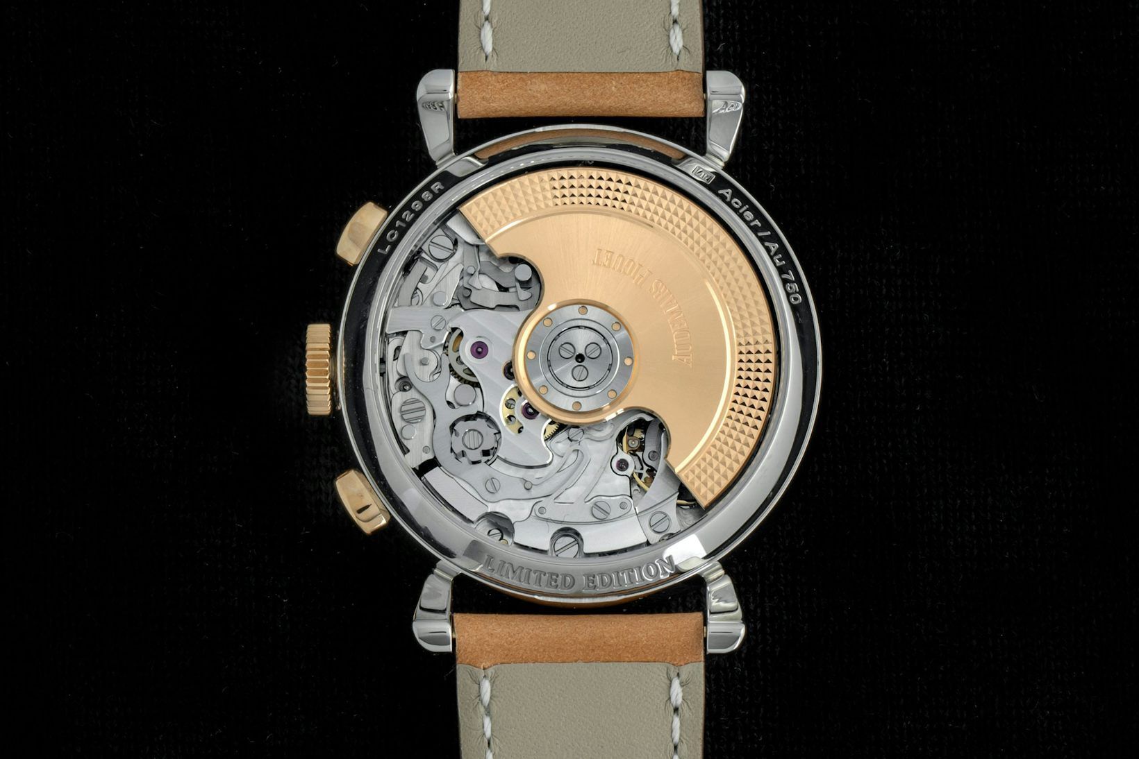 As we discussed in our Hands-On with the Code 11.59 chronograph, the modernity of the movement is more than skin deep. This is a vertical clutch design, with a 70-hour power reserve, a tooth profile for the column wheel designed to minimize friction, ceramic bearings on the rotor, and a single, integrated reset hammer. There’s a balance bridge, rather than a balance cock, and the balance is a freesprung, adjustable mass-type.
