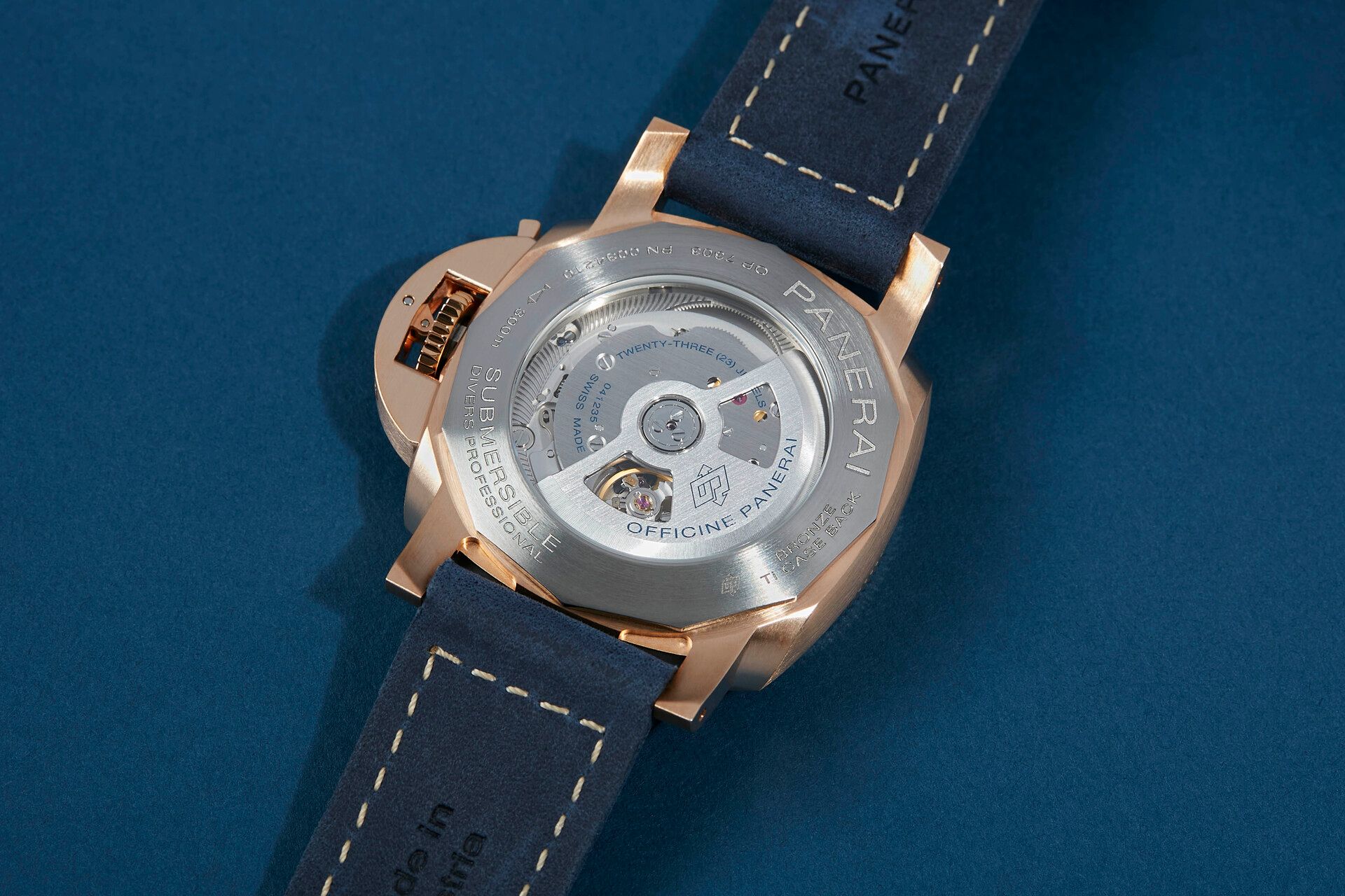 Flip the Bronzo Blu Abisso over and you see that not all of the watch is actually bronze. You get a sapphire window onto the automatic P.900 movement and a titanium caseback. The P.900 is the renamed OPXXXIV, a smaller and thinner automatic movement used by Panerai in some of its smaller watches. It offers a full three days of power reserve while running at a conventional rate of 4Hz (28,800 vph).