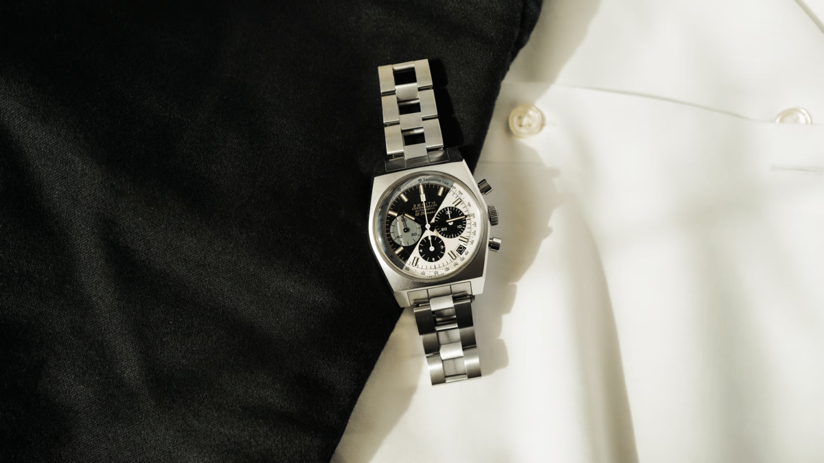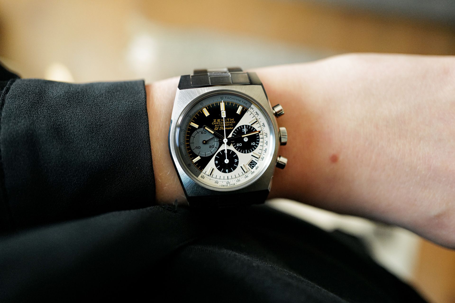 One thing that strikes me is how pronounced the 4:30 date window is on the white dial portion. In fact, I think this would look better if the colors were swapped. It would have effectively hidden the date aperture thus preserving most of the dial symmetry. At the end of the day, 4:30 date windows are a hallmark of vintage Zenith design, so maybe the brand wanted to highlight it in this way.
