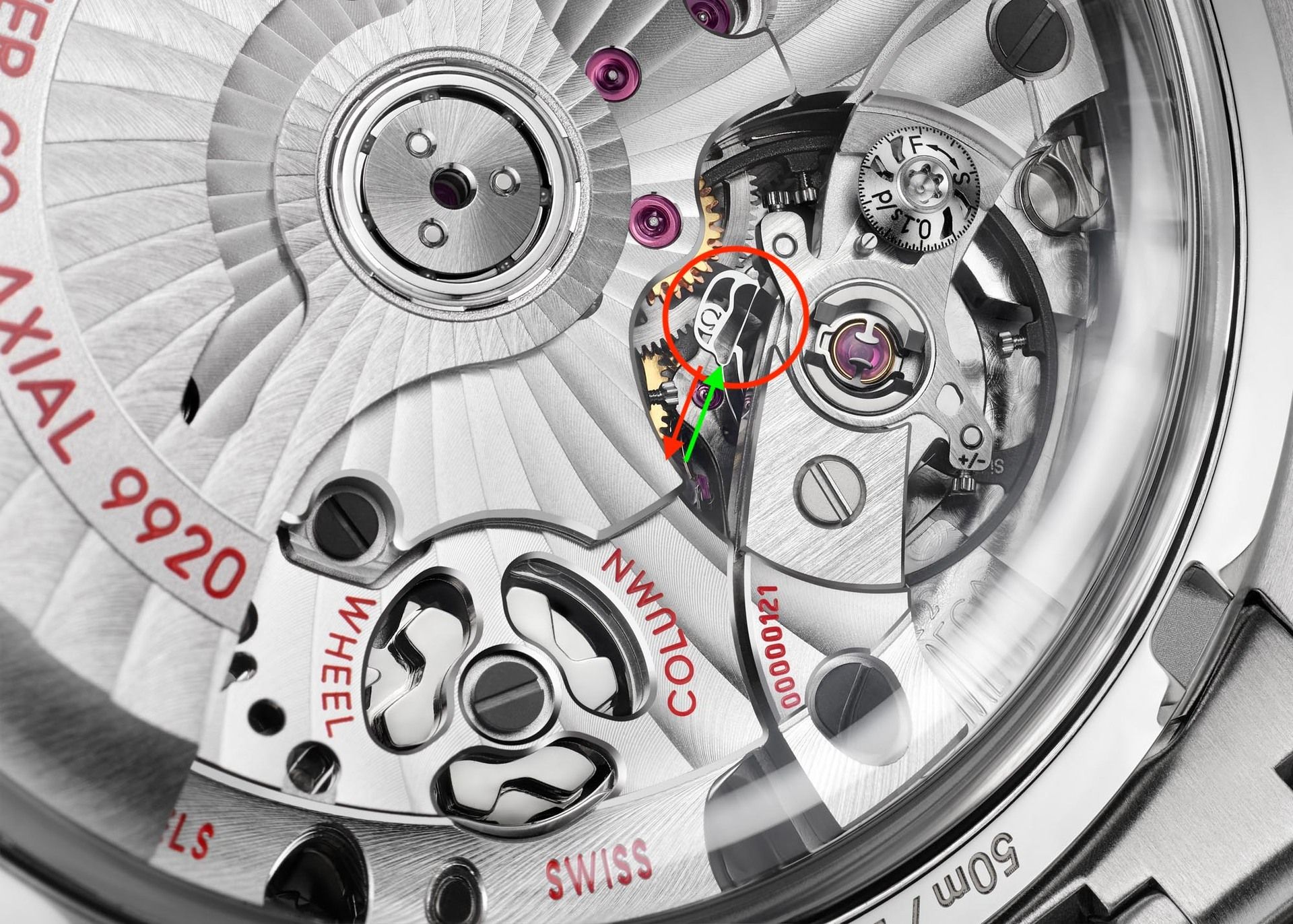 According to Hines, it seems that the regulating arm and the snail cam allow for regulation of the hairspring: the regulating arm can be directly adjusted for larger adjustments, while the snail cam allows for the micro-adjustment to 1/10th of a second that Omega’s touting, allowing for regulation to 0/+2 per day. When you adjust the attachment point of the Spirate System’s tail on the balance bridge, the tail pushes or pulls on the flexible blade, adding or removing tension. Since the blade is attached to the hairspring, this then acts on the hairspring. For example, pushing on the blade by adjusting the tail’s attachment point closer will increase tension in the blade, then causing the hairspring to increase in stiffness, causing it to beat faster.