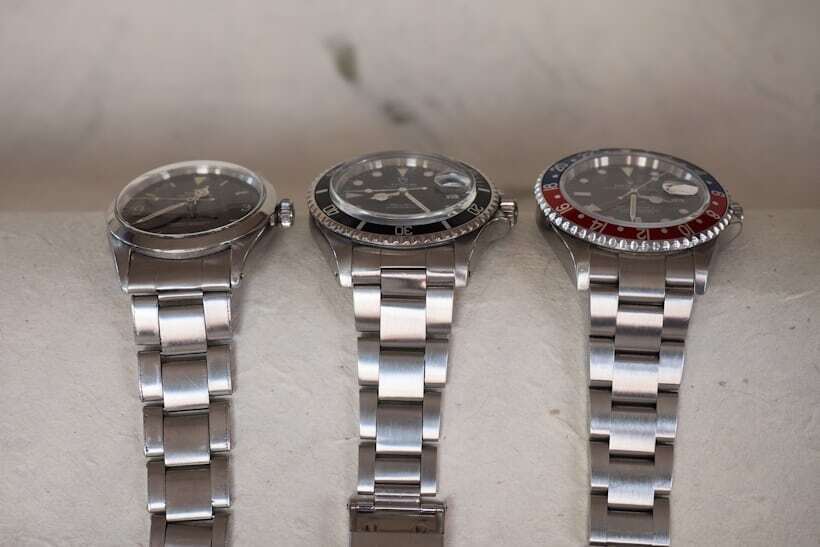 Three generations of Oyster bracelets, with the rivet on top, the folded link the middle, and the solid link on the bottom.