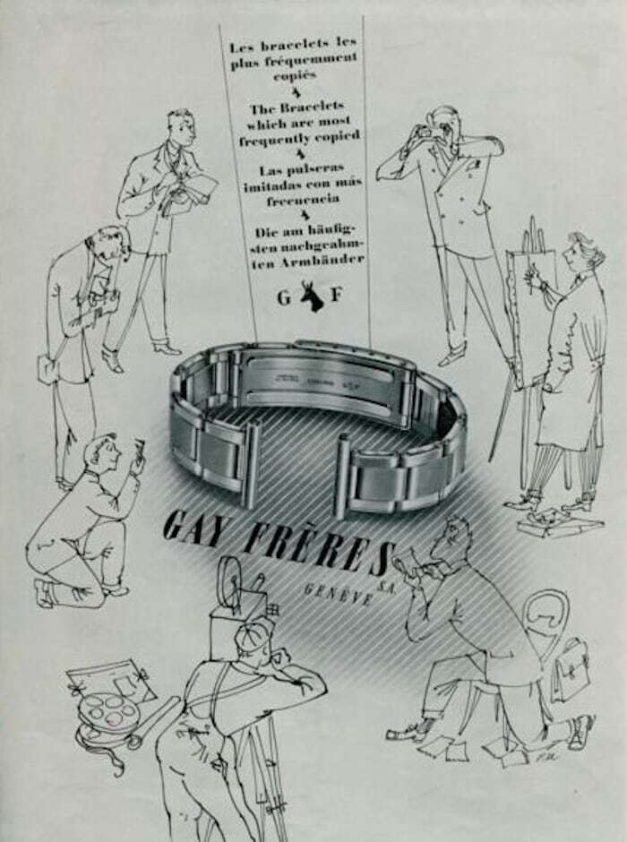 Vintage ad for Gay Frères, featuring a bracelet that looks an awful lot like the Oyster.