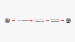 Next up is C.O.S.C or The Official Swiss Chronometer Testing Institute. This independent organization tests the isochronism of a watch movement. Isochronism is the same principle that allows a pendulum’s swing to be equal on both sides. The process of having a movement COSC certified is as follows. A manufacturer, like Rolex will send just the movement to the Organization and they will perform a series of tests to determine if the movement is within the standards. The most recognized criteria for the certification is the average daily rate, which is -4 or +6 seconds, or up to 10 seconds per day. If the movement meets this standard, as well as the others then the movement receives the “Chronometer” certification. The movement is then returned to the manufacturer and assembled into a watch.