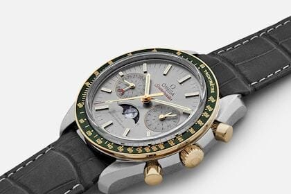 Other than the colors and materials at use, this Speedmaster Moonphase is similar to the better-known, and equally attractive, blue-dial variant. That includes the dial orientation, with its photorealistic moon-phase at six o’clock (complete with a reproduction of Buzz Aldrin’s footprint near the Sea of Tranquillity where the Apollo 11 Eagle lander touched down) that only needs to be adjusted once every 10 years, a stacked hour and minute register at three o’clock, and a combined date and running seconds display at nine o’clock.