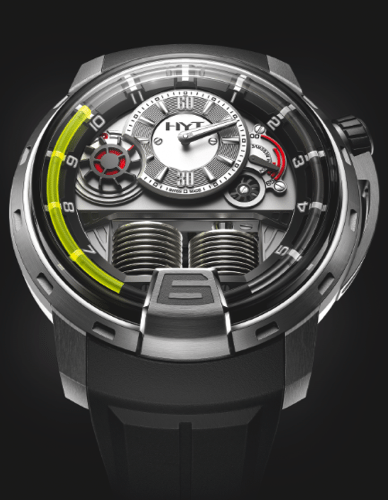 At Baselworld, we had the opportunity to take a look at HYT and its watches. That began our intrigue into the brand. With one glance at the HYT watches, it is obvious that these are not your typical luxury watches. On first glance, one’s initial thought might be, “Huh?”. And I think that is probably HYT was trying to achieve. This watch inspires intrigue and curiosity. The typically watch has a hand to tell the hour, minute, and often the seconds. There is a silver subdial in the middle of HYT dial that has a hand to show the minutes and a smaller dial to show seconds. But what about the hours? That is where this watch gets interesting. The hour and minute are display around the edge of the dial with a liquid that travels around the dial. You hear that and you think “I thought liquid inside of a case can corrode the movement of a watch?”. And that is why HYT’s technology and innovation is so amazing.