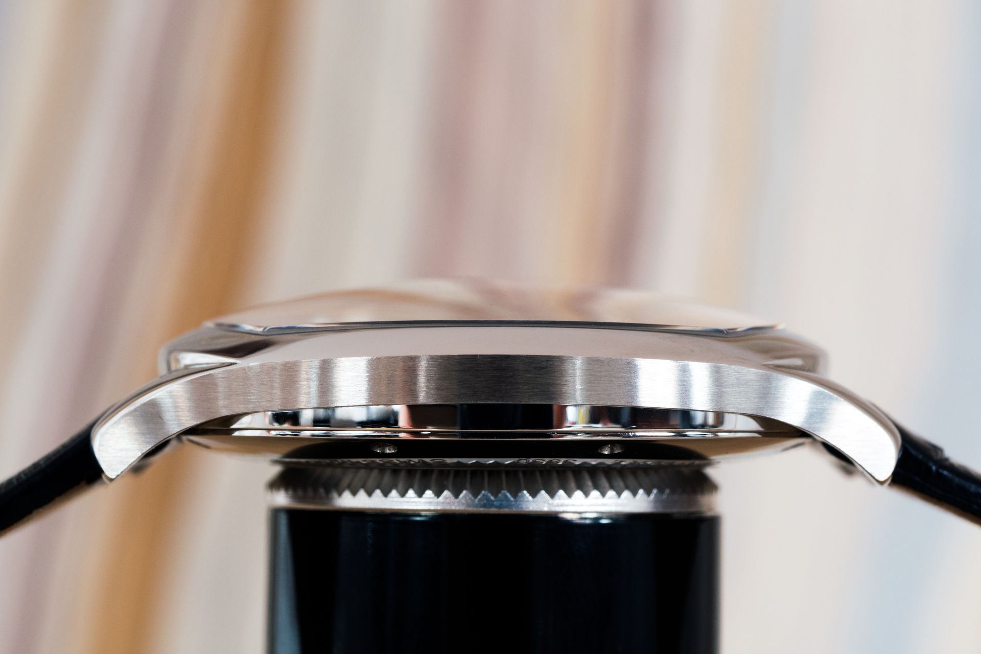The case shape is also more complex than it appears at first glance – brushed and polished surfaces emphasize its unusual geometry, including the gentle inward slope of the bezel and case middle, as the area between the lugs transitions from a curve to a straight line. This minimizes the gap between the curved case, and the straight inner ends of the strap.