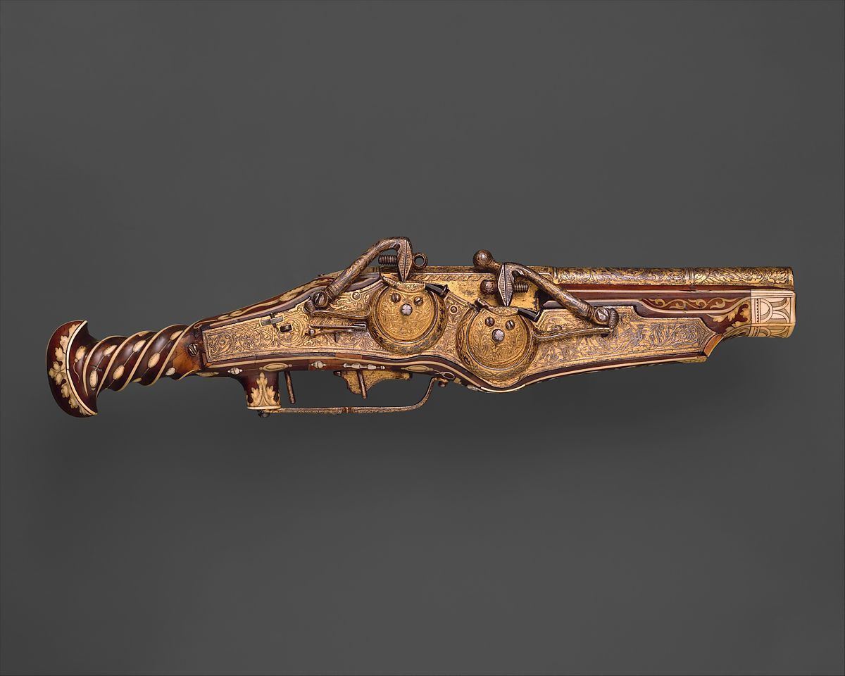 Wheellock double pistol, circa 1545, by Peter Peck, made in Germany for Emperor Charles V. Metropolitan Museum Of Art. One of the earliest known pistols.