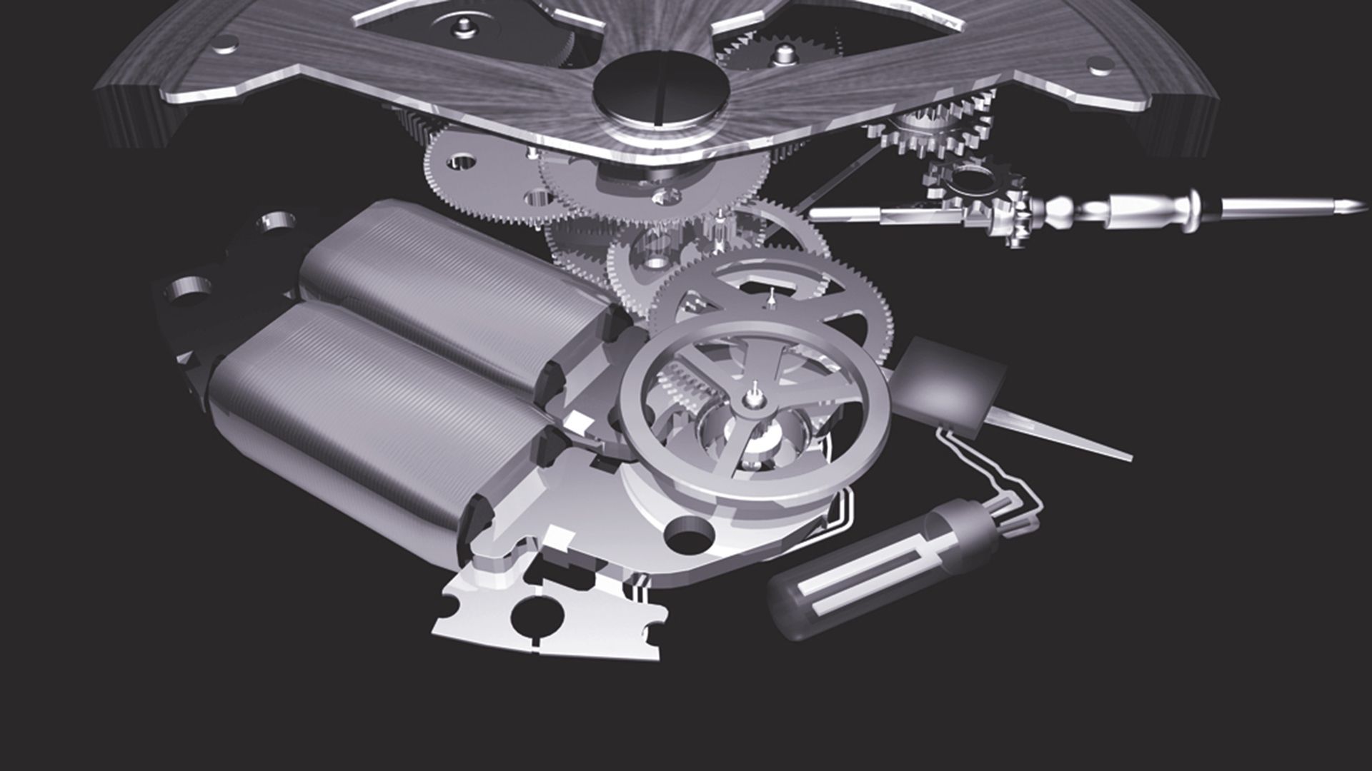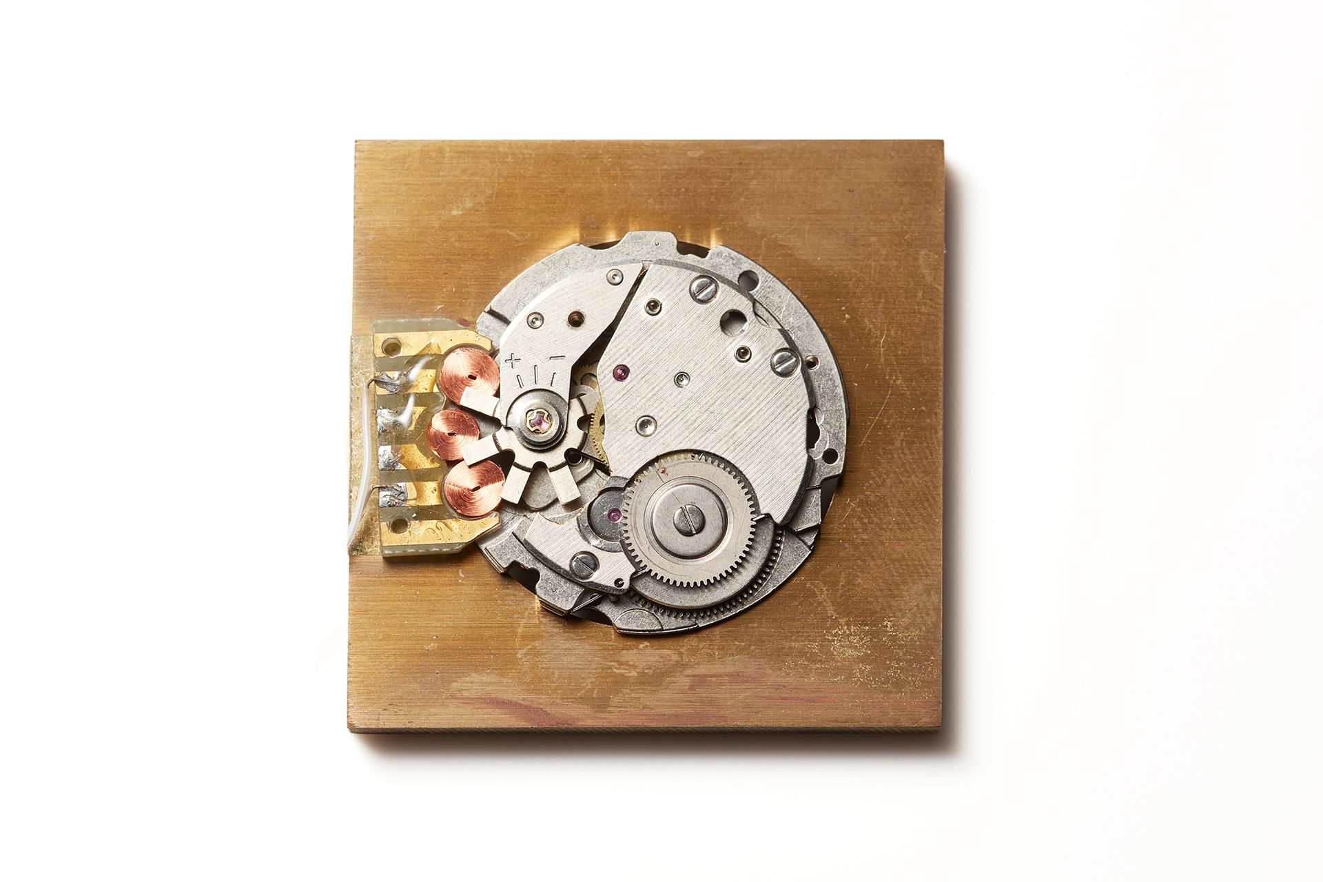The Tri-synchro regulator itself consists of the glide wheel, coil-wound stators, and the IC and quartz oscillator that constitute the actual regulating system. In a Spring Drive movement, the glide wheel, stators, and IC fulfill the functions of the escape wheel and lever in a conventional mechanical watch, while the role of the balance wheel is fulfilled by the quartz crystal.