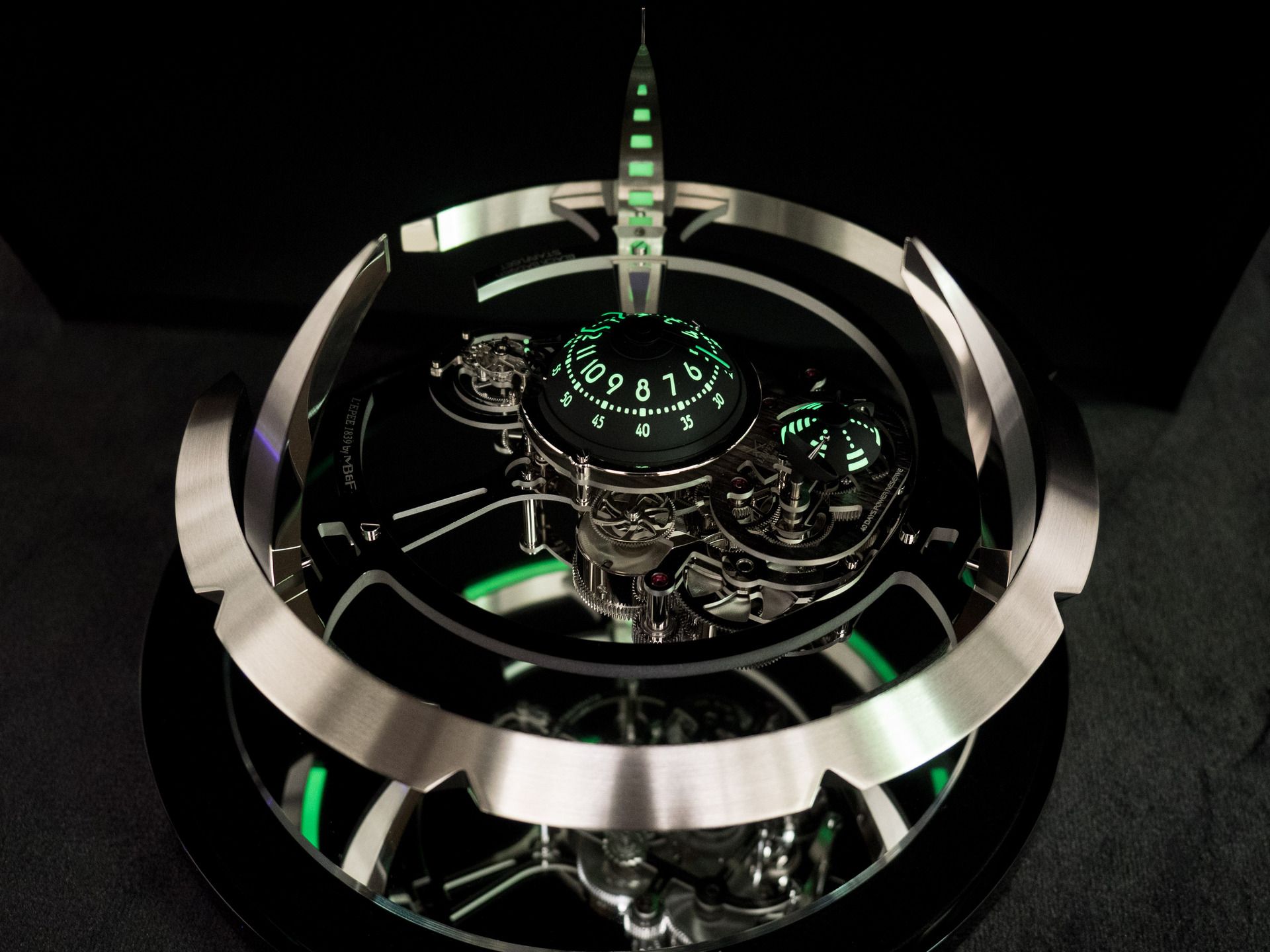 Strontium aluminate is a much more efficient phosphor than zinc sulfide – it’s about ten times as bright and glows about ten times longer and the color can vary between various shades of green and blue, with blue supposedly producing the longest glow time, and green offering better brightness. The disadvantage of Super-LumiNova in comparison to radioluminescent material is of course that its brightness fades until it’s recharged by another exposure to light.Personally I’ve found that with most of the sports watches I’ve owned over the years, if my eye’s dark-adapted the watch remains legible, with some difficulty, through most of the night. Still, it is a disadvantage of the material relative to the always-on glow of radioluminescent solutions (which is part of the appeal of Luminox and Ball). You can also get some pretty high wow-factor visual effects with Super-LumiNova that have much better permanence than they would have with radioluminescent pigments; Bovet has used the material to great effect in the Récital 22 Grand Récital, as has MB&F in the Black Badger collab version of its Starfleet Machine.