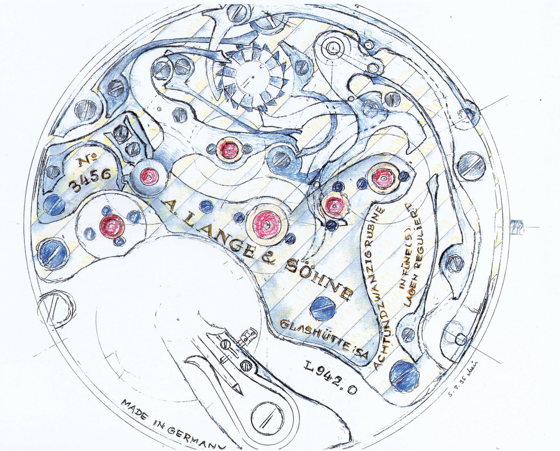 Pre-production prototype sketch, dated 1995. The movement in the 1815 Chronograph is Lange caliber 942.1.