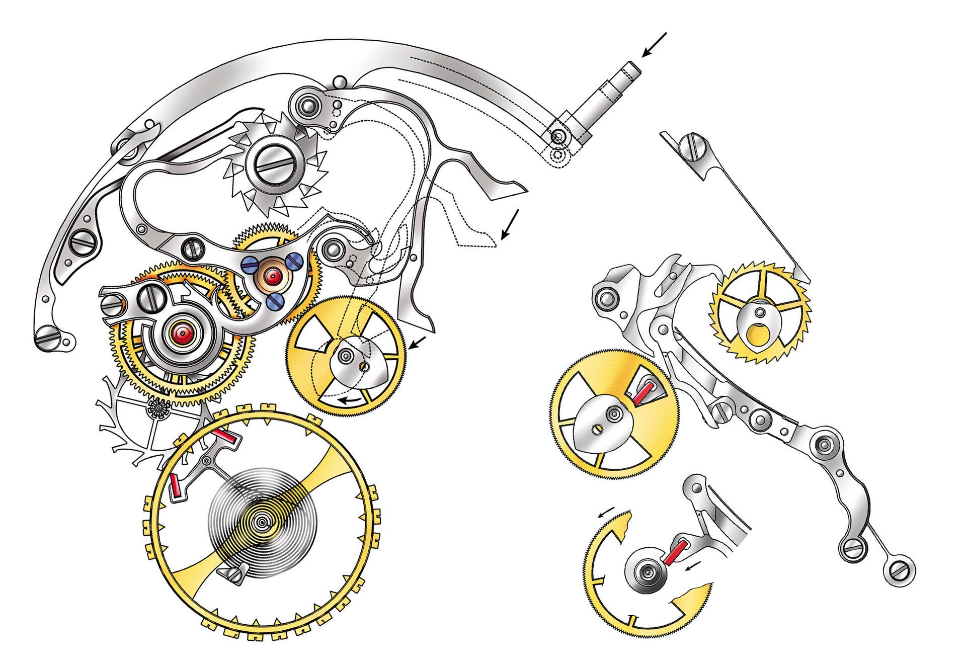 Chronograph components of the Datograph movement. Left, the chronograph driving gears and reset action; right, the operation of the instant jumping minute counter.