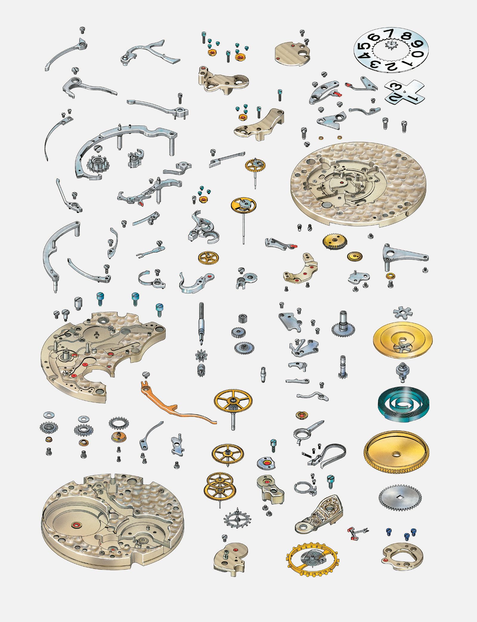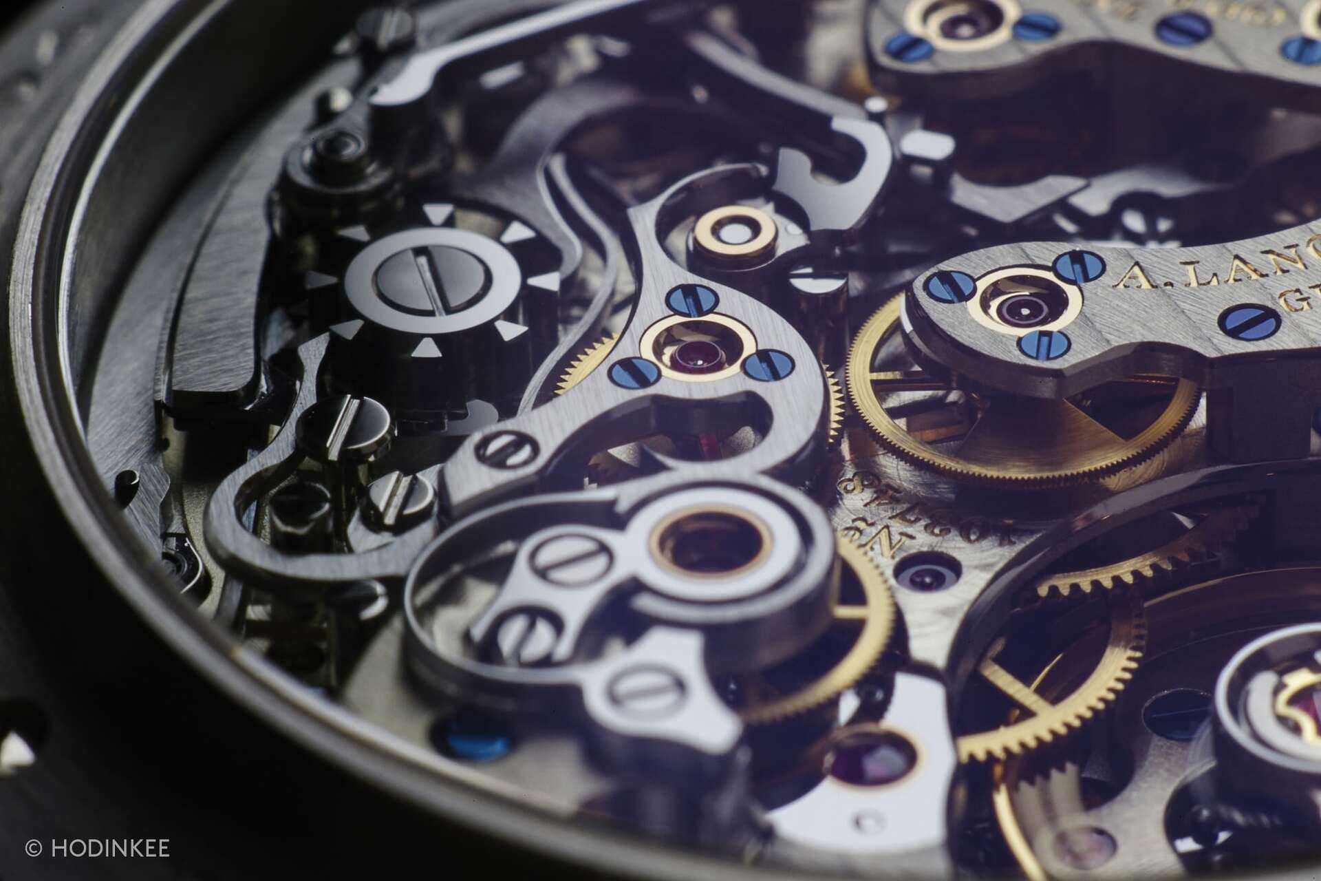 The main problem in creating the L951.1, according to Lange, was that the sub-registers placement had been established in terms of design, which meant the movement had to be organized around their placement. Annegret Fleischer remarked, “It was one of the many challenges we were faced with. The difficulty was that the axes carrying the hands of the small seconds and the minute counter had to be arranged very close to the units disc of the outsize date, which left less room for the chronograph mechanism. The idea to arrange the outsize date and the two sub-dials in a way that they form an equilateral triangle was born during a creative meeting with Günter Blümlein and the former director of product development Reinhard Meis. It should be mentioned that the dial layout was developed first before I had to find the solution to fit in the mechanisms.”
