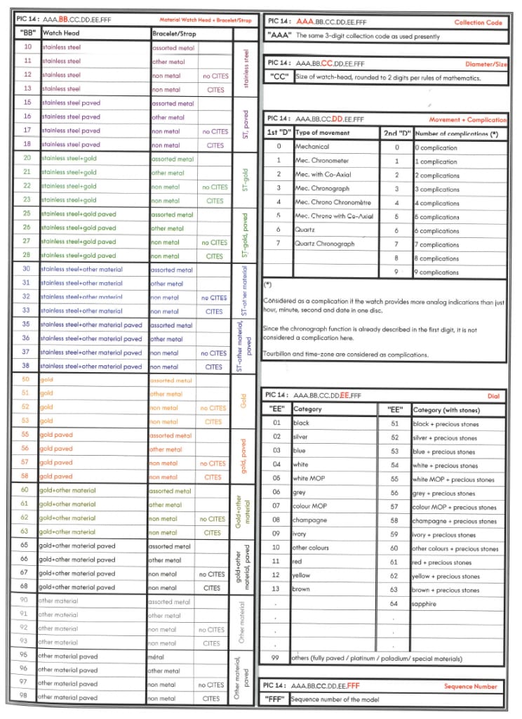 In 1988, Omega changed to its PIC system (product identity code), an eight-digit numbering system that added to the previous MAPICS system by coding the dial color and band material. Around 1990, Breitling switched to a 12-digit numbering system that gives COSC and caliber identification, case finish, as well as dial color and design.