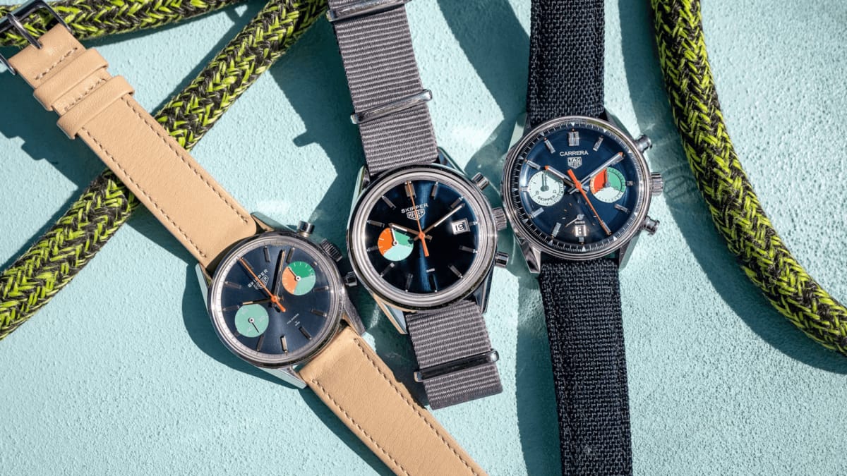A collection of vintage Heuer ref. 1158s; the dials can be quickly identified based on an alphabetical suffix added to the reference number.