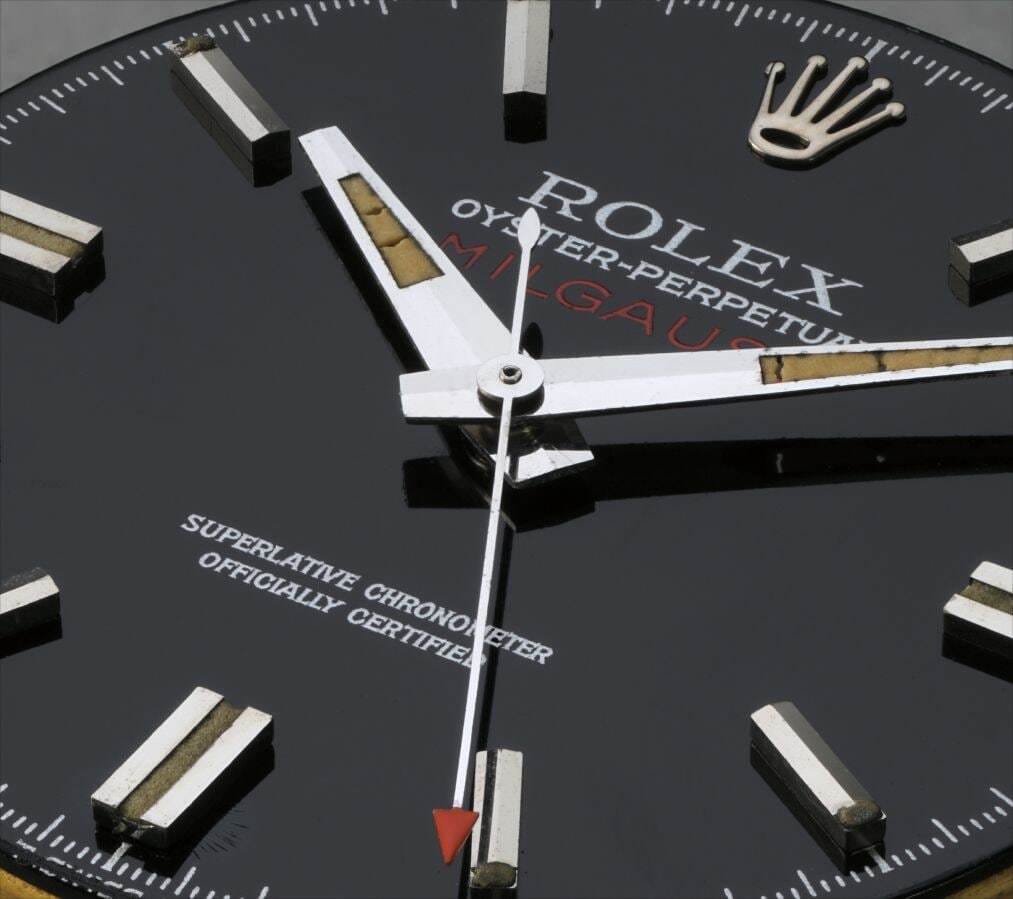 Perhaps the rarest 1019s are the three known examples with glossy black dials – Phillips sold one in 2017 for CHF 150,000. It’s a true gilt, glossy dial: note how the red “Milgauss” text appears to be printed in relief. On the matte black versions, the red text pops off the dial instead.