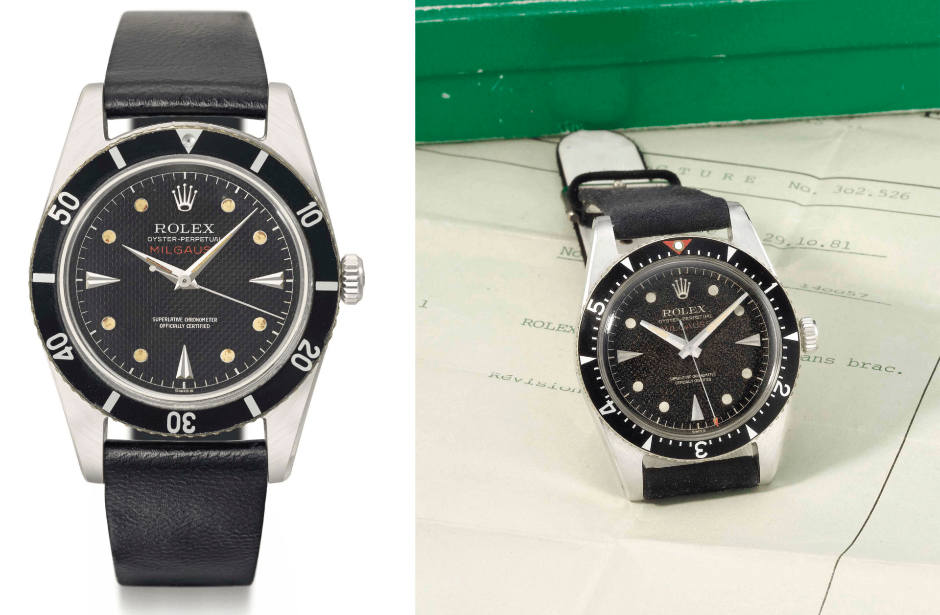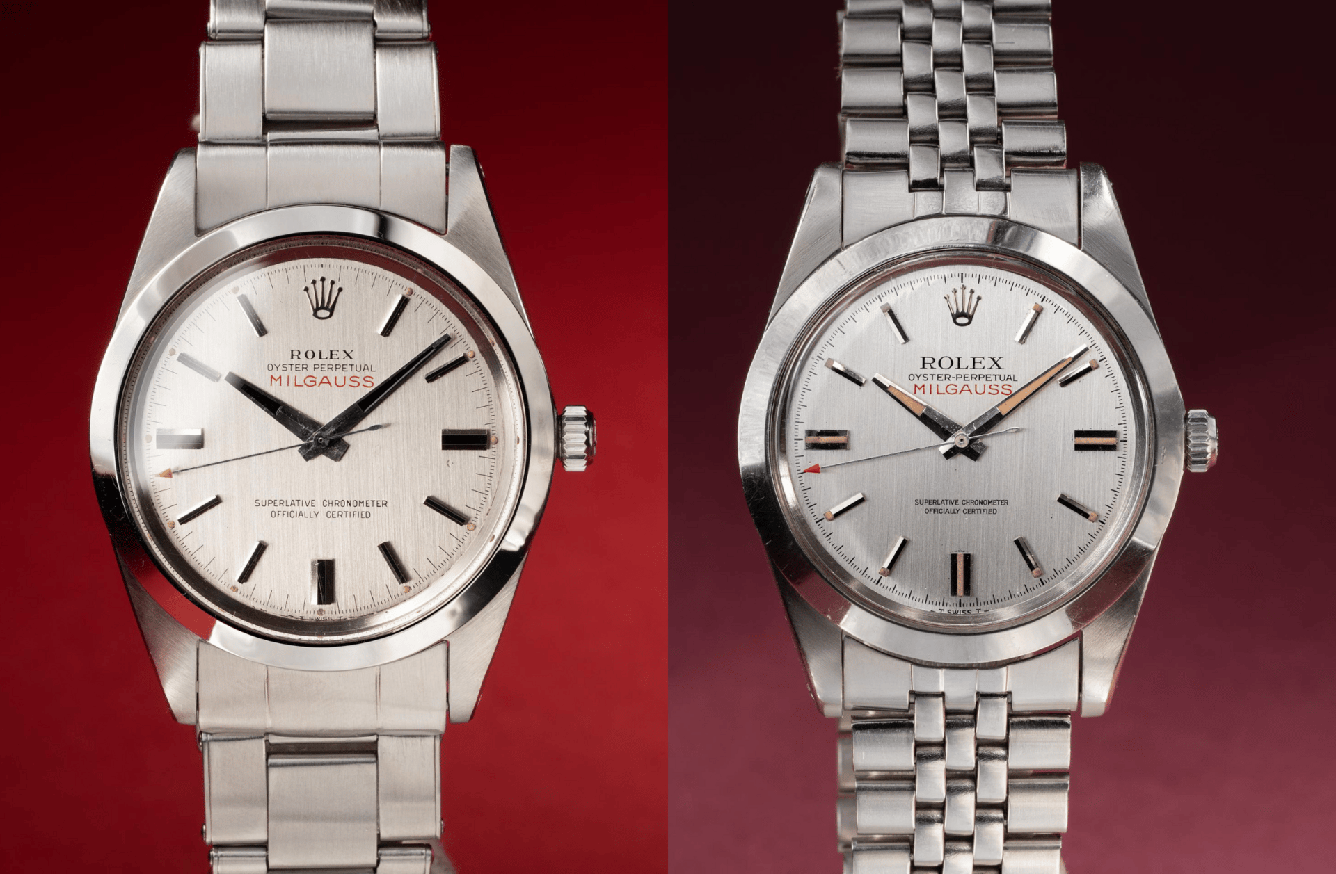 Two examples of the early Milgauss 6543: the first has an early Sub bezel, while the second has a later-added bezel from the ref. 6541. Both images: Corutesy of Christie’s