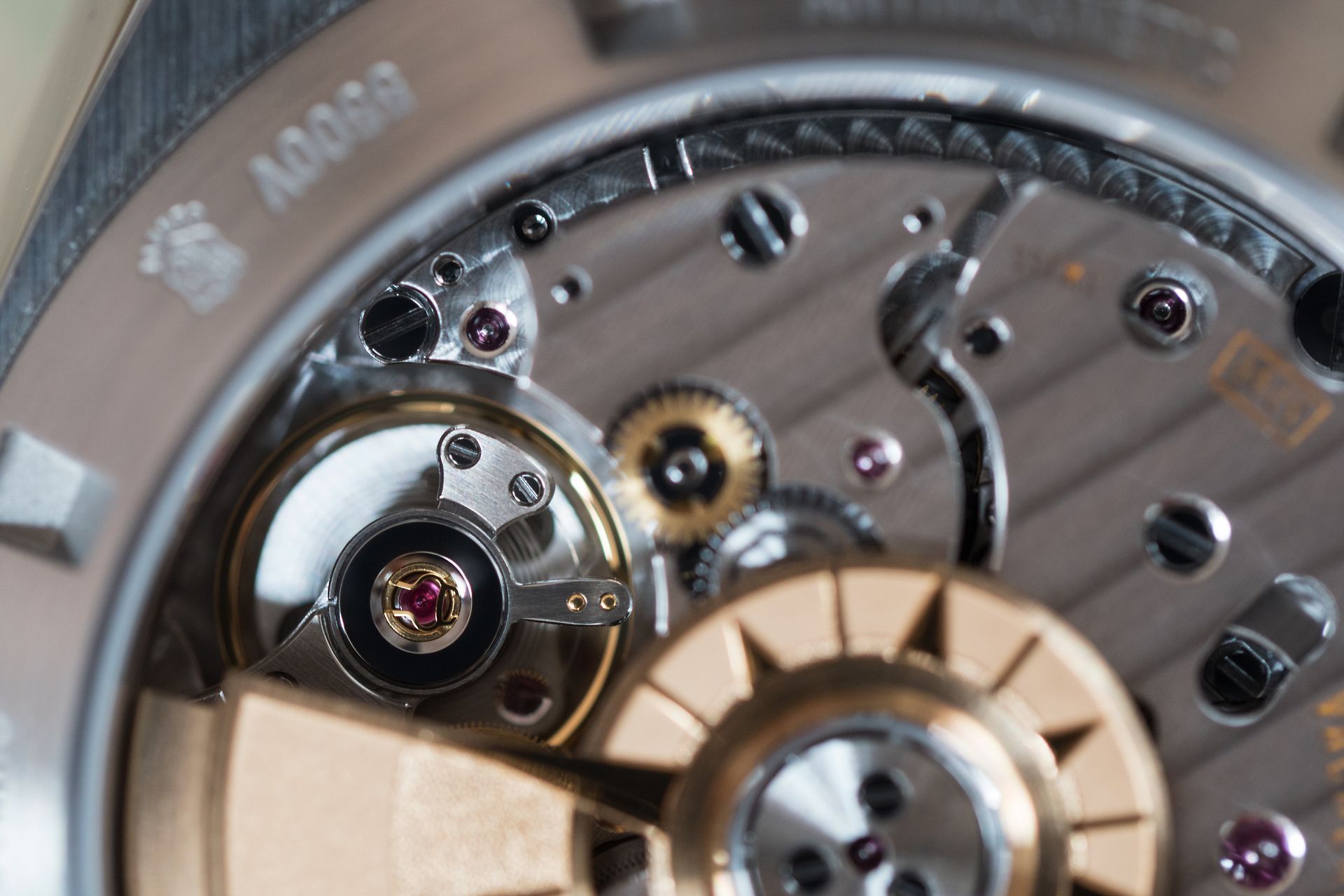 One feature of the Overseas Chronograph is that, like some other Overseas models, there is some degree of antimagnetic shielding, in the form of a soft iron ring; the antimagnetic rating is a very respectable 25,000 A/m (amperes per meter). While the level of protection is not what you’d get with a soft iron dial and full enclosure, the latter are not necessary to achieve a lesser level of still-useful shielding – soft iron (also known as mu metal) is a nickel-iron alloy that works by providing a preferred pathway for magnetic field lines, so the movement ring will tend to direct a magnetic field away from susceptible movement parts. (The international standard for antimagnetic watches, ISO 764, specifies a minimum of 4,800 A/m).