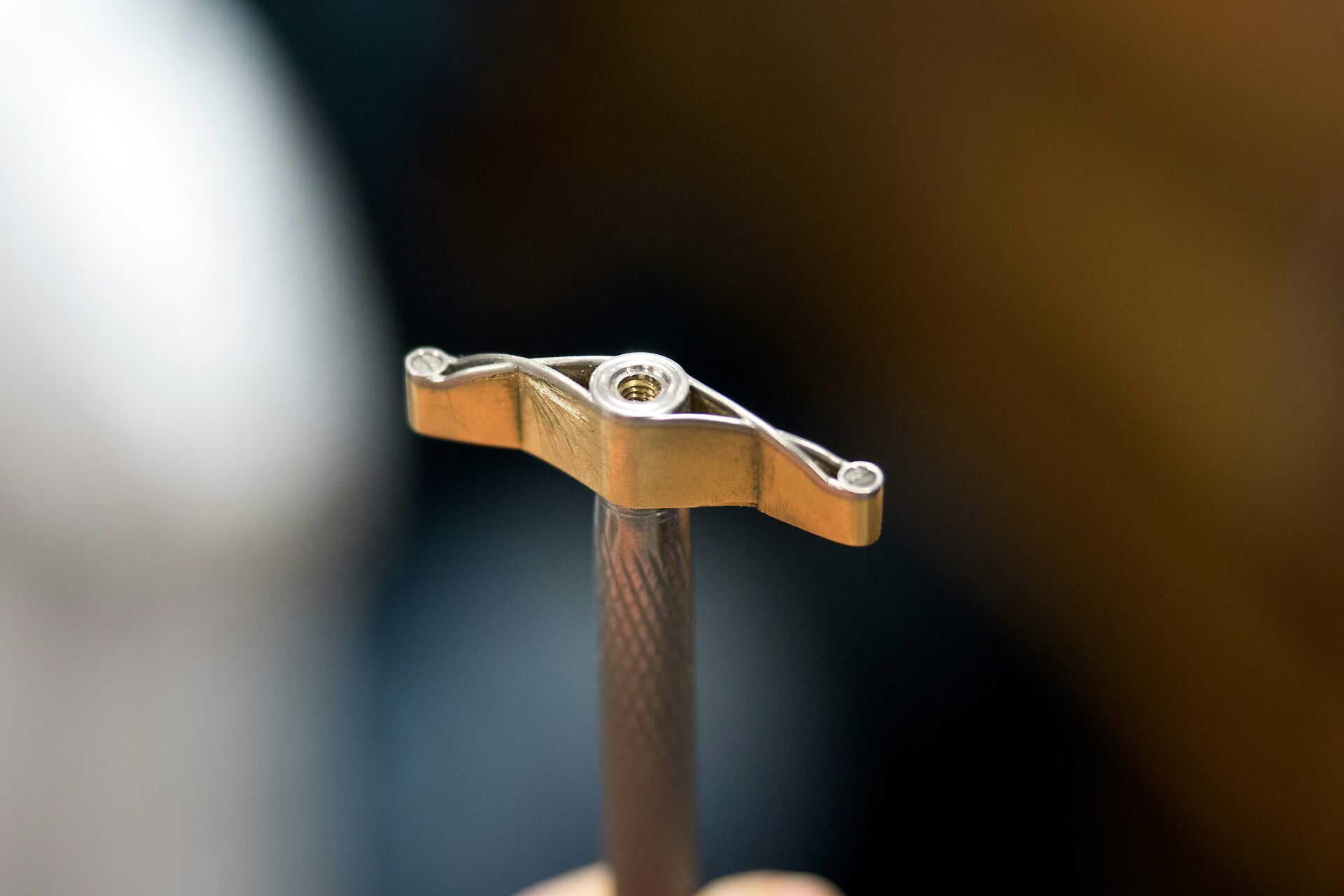 Pithwood being used to polish the bridge of a Montblanc Minerva tourbillon.