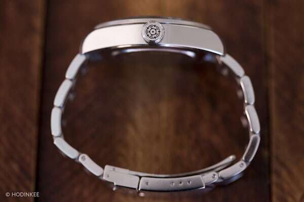 The case is slightly larger than the dive watches it’s based on, and it doesn’t appear to be due to anything other than a less expensive and larger movement. That’s understandable for a watch in this price range, but it’s still the biggest giveaway that this is not a true vintage piece. Fashioned out of 316L steel, it’s the same metal that Rolex was using on their steel watches until they recently switched to their own 904L alloy. The top of the lugs are satin finished, while the sides are polished. Another great touch is that the case lugs are beveled, something Rolex no longer offers. (Score one point for looking like a true vintage piece.) I do find that the outer corners of the case lugs are quite sharp, something experienced more on a strap than a bracelet.