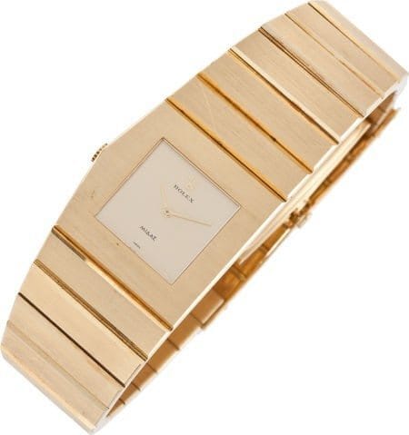 The King Midas featured gold baton hands, sapphire crystal, manual wind movement, and solid 18-karat yellow gold case and bracelet with a deployant buckle. The words “King Midas” are etched on the clasp and on either side of the crown.