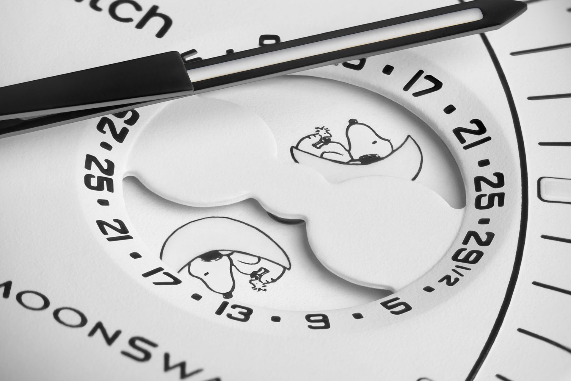 The white dial and placement of Snoopy in a sub-register is carried over into this new MoonSwatch. But with the Mission to the Moonphase, Snoopy has a far more active and functional role (on par with his rocket around the Moon on the caseback of the 2020 rendition of the Silver Snoopy Speedy).