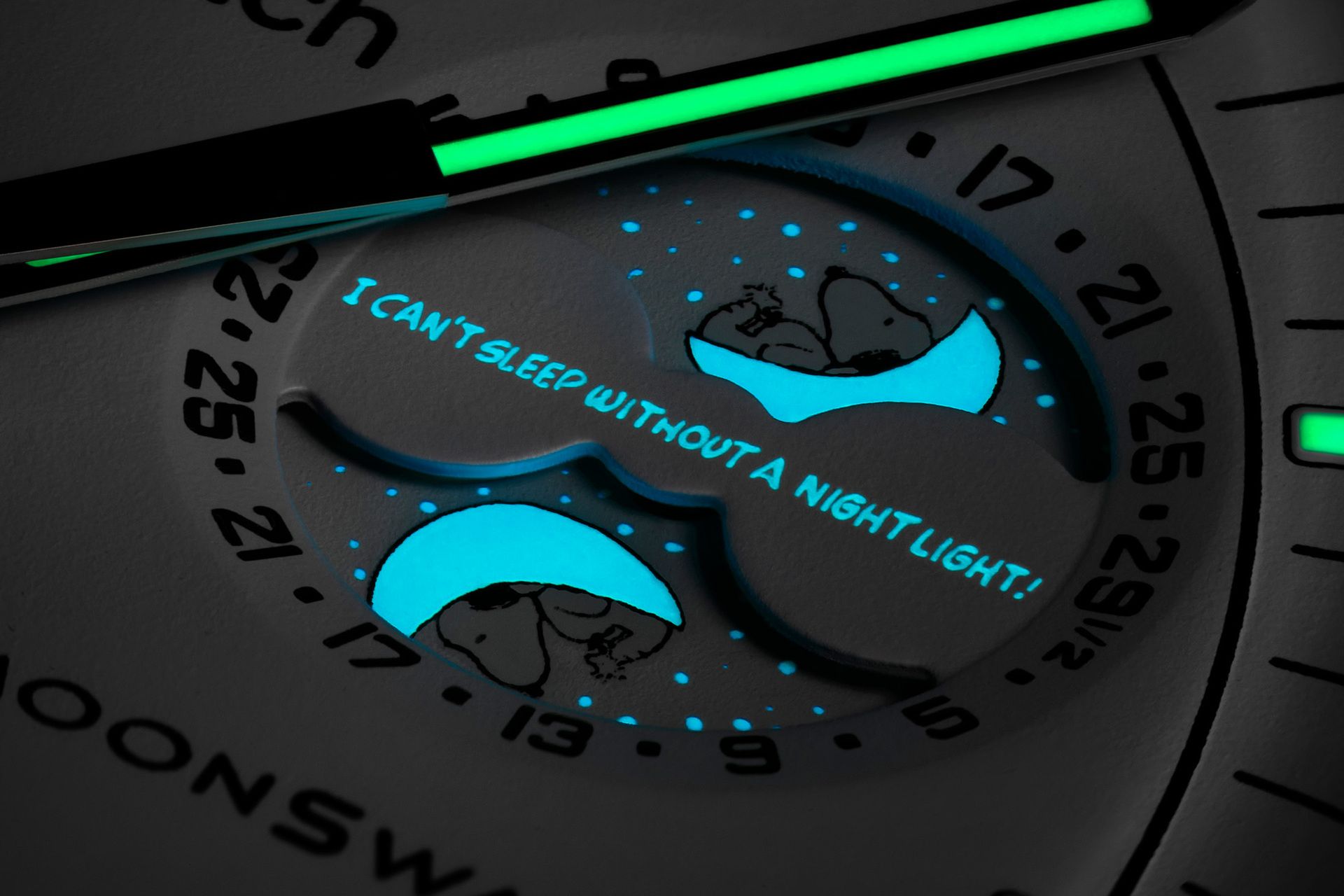 Here we find Snoopy on the moon phase disc in the two o’clock subdial which is labeled to represent the 29.5 days it takes for the Moon to complete a phase. But of course, there’s more to be seen here when the lights go out. A hidden quote from Snoopy’s comic strip is revealed under UV light which reads “I can’t sleep without a night light!” This again references the 2015 model which had a comic strip quote that read “Failure is not an option.”