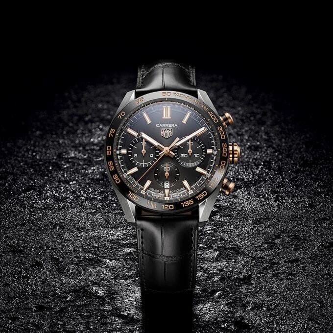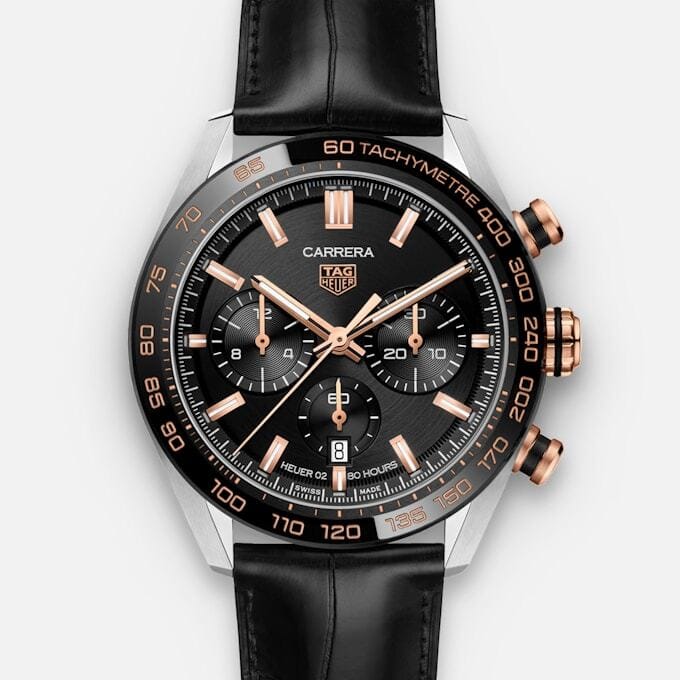 The most recent two-tone watch to land in the HODINKEE Shop, this take on TAG Heuer’s classic Carrera chronograph pairs an inky black dial and ceramic bezel with rose gold elements, all inside a large 44mm case profile.
