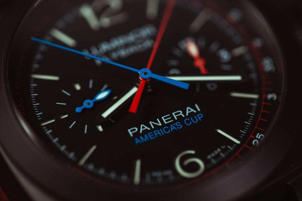 In addition, the watch showcases an all-black design with a matte ceramic case and bezel coupled with a leather strap. Accents of red and blue not only honor the race but also serve a purpose. The blue of the chronograph seconds hand gives it optimal legibility against the all-black color scheme. It’s contrasted by the red minutes hand. Panerai also offset the sub dials with the red and blue hues. The running seconds sub dial at the nine-o’clock position features a blue hand. Then, the elapsed hours sub dial at the three-o’clock position features a red hand. In addition, Panerai carries these pops of color onto the strap, which includes both red and blue stitching.