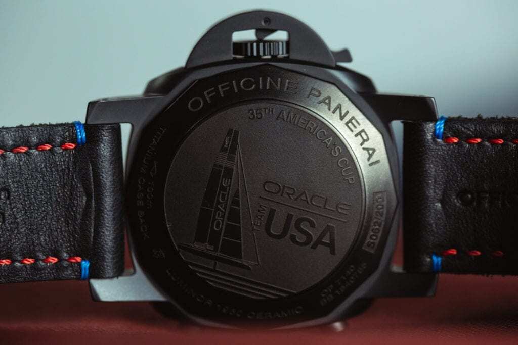 Of course, the Luminor 1950 Oracle Team USA Chrono Flyback Limited Edition PAM 725 wouldn’t be complete without commemorative markings. The brand prominently displayed the America’s Cup logo under their own on the dial. However, the caseback is where the team and event really shine. It showcases an engraving of the Oracle Team USA logo, complete with the profile of a sailboat.
