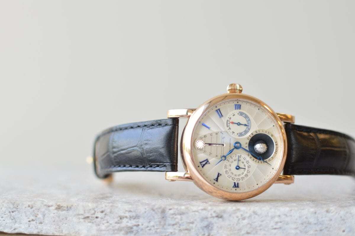 The watchmaker, Christiaan van der Klaauw, began his career creating clocks in 1974, quickly becoming recognized as one of the best and most innovative clockmakers in the world. He began making wristwatches in 1994, bringing a particular interest in astrological complications to his designs; van der Klaauw’s watches are all handmade by the watchmaker himself.
