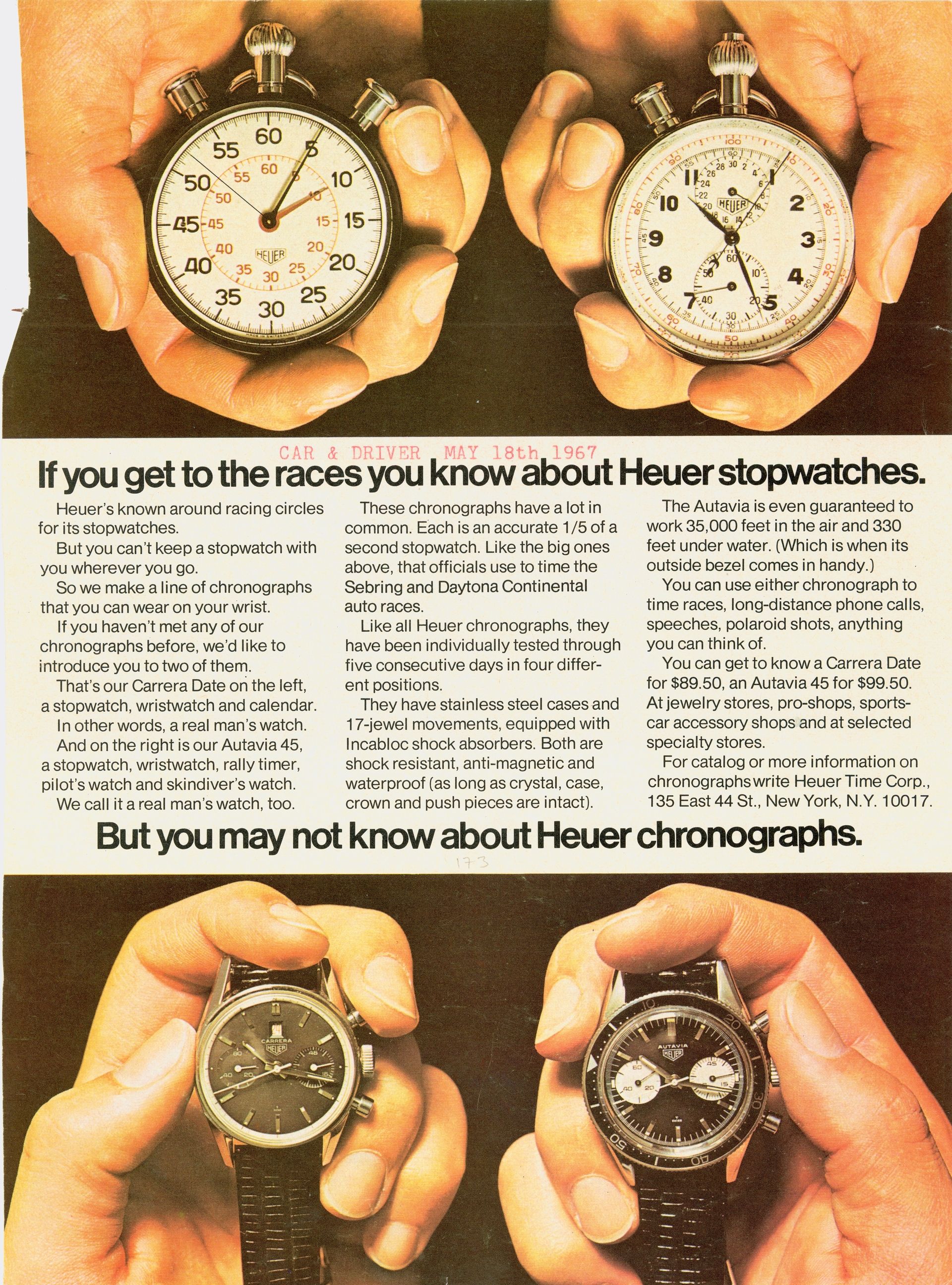 Starting around 1955, Heuer began to produce wrist chronographs with three registers, a Valjoux movement, and larger, water-resistant cases. The dials frequently featured luminous markings and scales. Period advertisements would describe those with a tachymeter on them as positioned for “Drivers and Rallyists.” These watches mimic Rolex’s Pre-Daytonas (references 6034, 6234, and eventually 6238) in considerable ways – one of which being that, like these Rolex chronographs, the dials simply read “Heuer” with no mention of “Carrera” anywhere on them, despite clearly being progenitors of the watches in question.