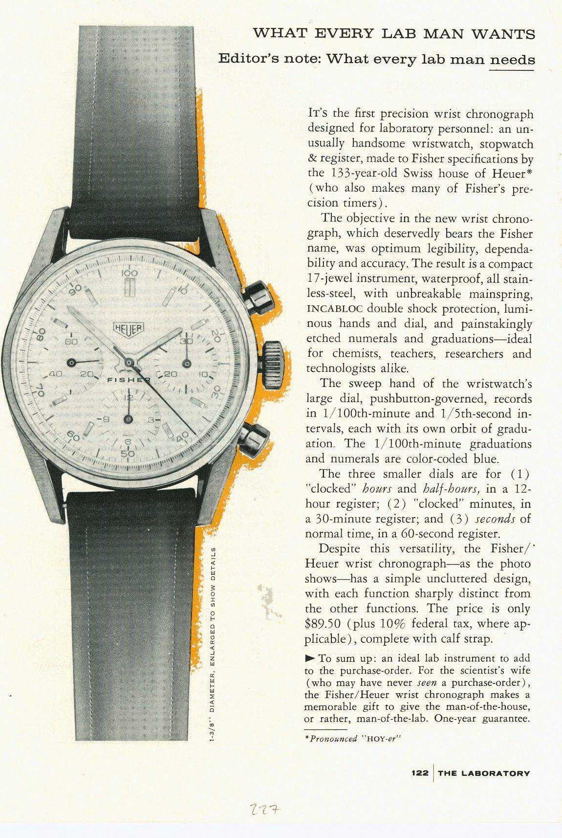 A 1963 Fisher advertisement for the Heuer Carrera – “what every lab man needs.”