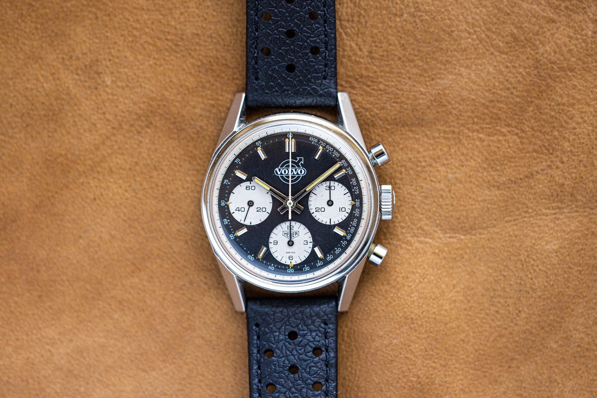 In the 1960s (today too, if we’re being honest), Volvo wasn’t the sexiest car brand around. But here we have a 2447NST featuring a tachymeter scale, with the Heuer logo swapped at 12 o’clock for the Volvo logo. The Heuer shield has been shrunken and moved to the six o’clock subdial.