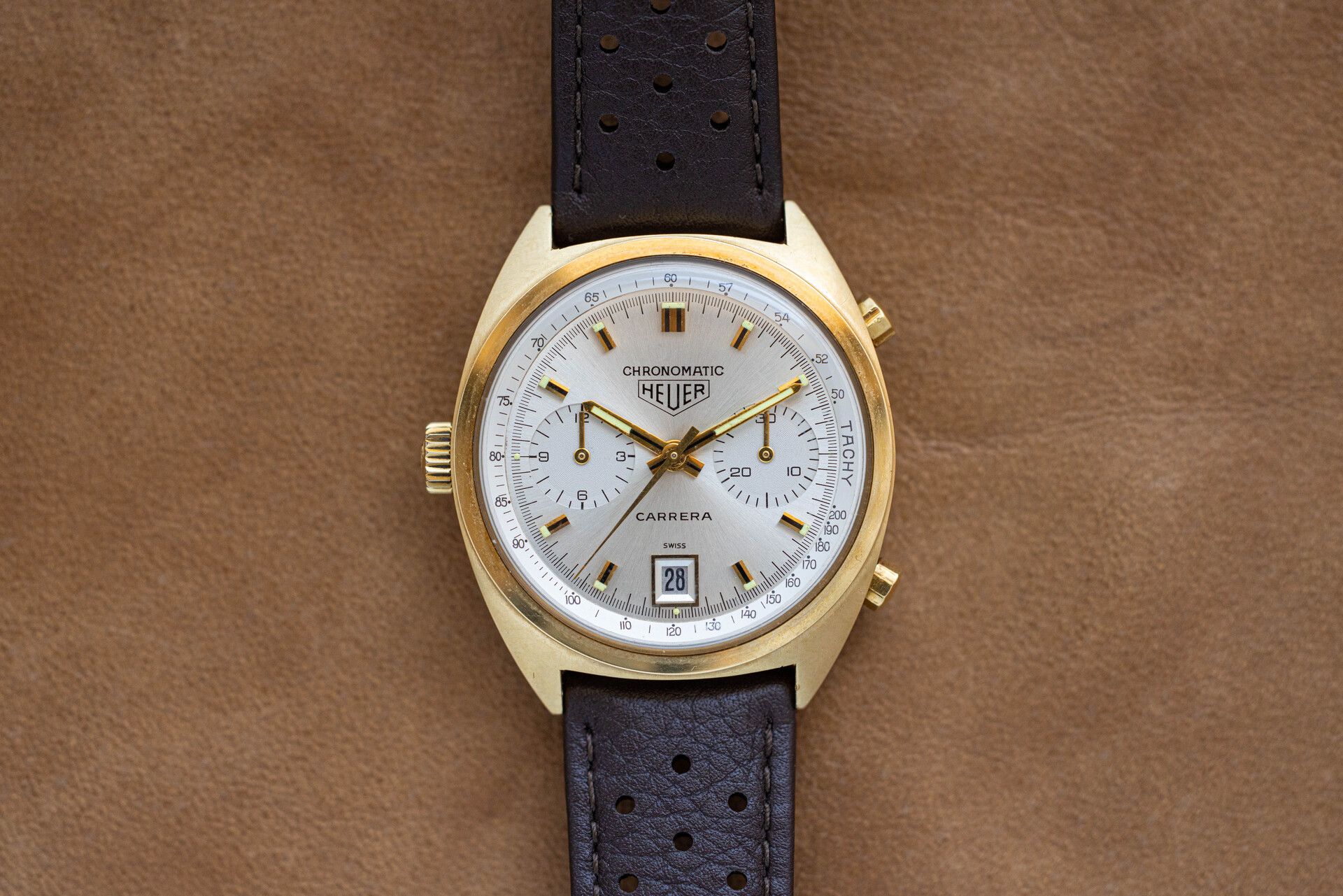 The first steel, automatic Carreras to be produced featured the word “Chronomatic” on them, above the Heuer logo. These are considered the rarest of the rare for this series and generally trade at many times a normal production automatic Carrera. The name would eventually be adopted by Jack Heuer’s friendly competitor Willy Breitling for use on its self-winding chronographs of a similar vintage. Later examples instead say “Automatic Chronograph” at 6 o’clock, with the Carrera mark at 12 o’clock above the Heuer shield.