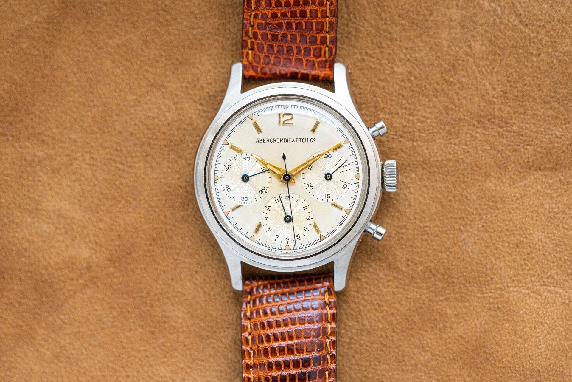Here we have a reference 2444 signed Abercrombie & Fitch on the dial. As you may know, Abercrombie used to be an outfitter for serious sportsmen, guys like Teddy Roosevelt and Ernest Hemingway. In those days, Abercrombie retailed Heuer watches to its customers, a relationship that began in 1940. The partnership resulted in famous watches like the Seafarer and Solunar, as well as more standard chronographs signed Abercrombie on the dial, like the pre-Carrera above.